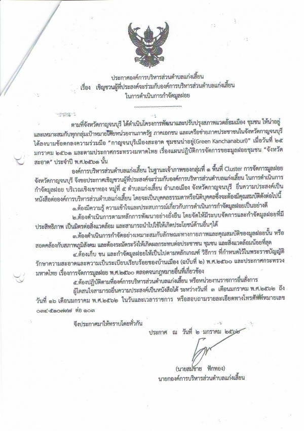ประกาศ เรื่องเชิญชวนผู้ที่ประสงค์จะร่วมกับองค์การบริหารส่วนตำบลแก่งเสี้ยนในการดำเนินการกำจัดมูลฝอย