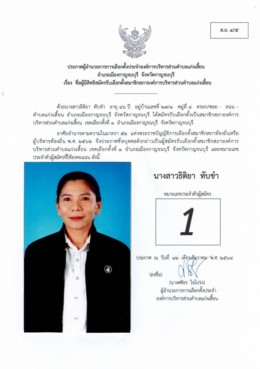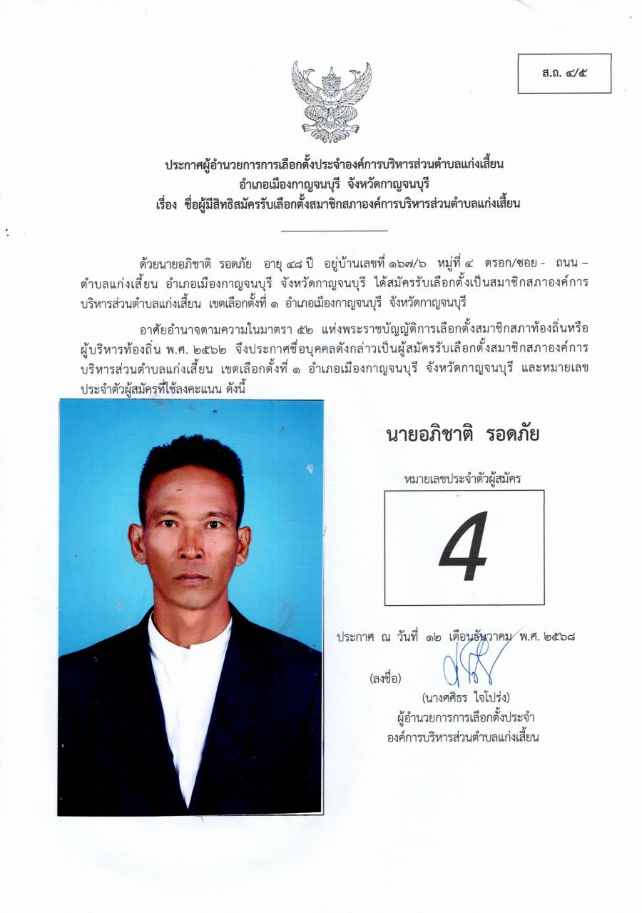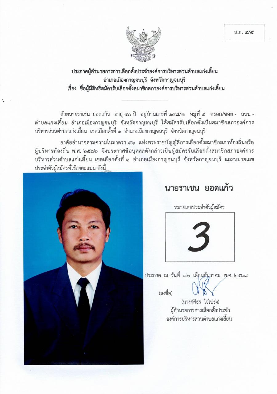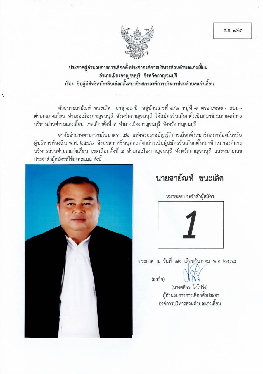 ประกาศบัญชีรายชื่อผู้มีสิทธิสมัครฯ(ส.ถ.4/4) และรายชื่อผู้สมัครรับเลือกตั้งสมาชิกภาองค์การบริหารส่วนตำบล องค์การบริหารส่วนตำบลแก่งเสี้ยน(ส.ถ.4/5)