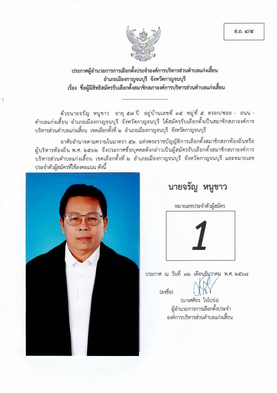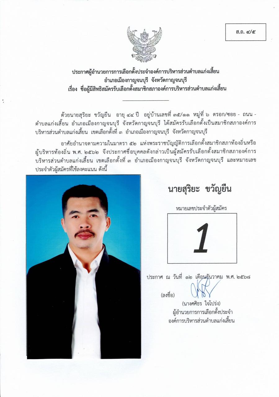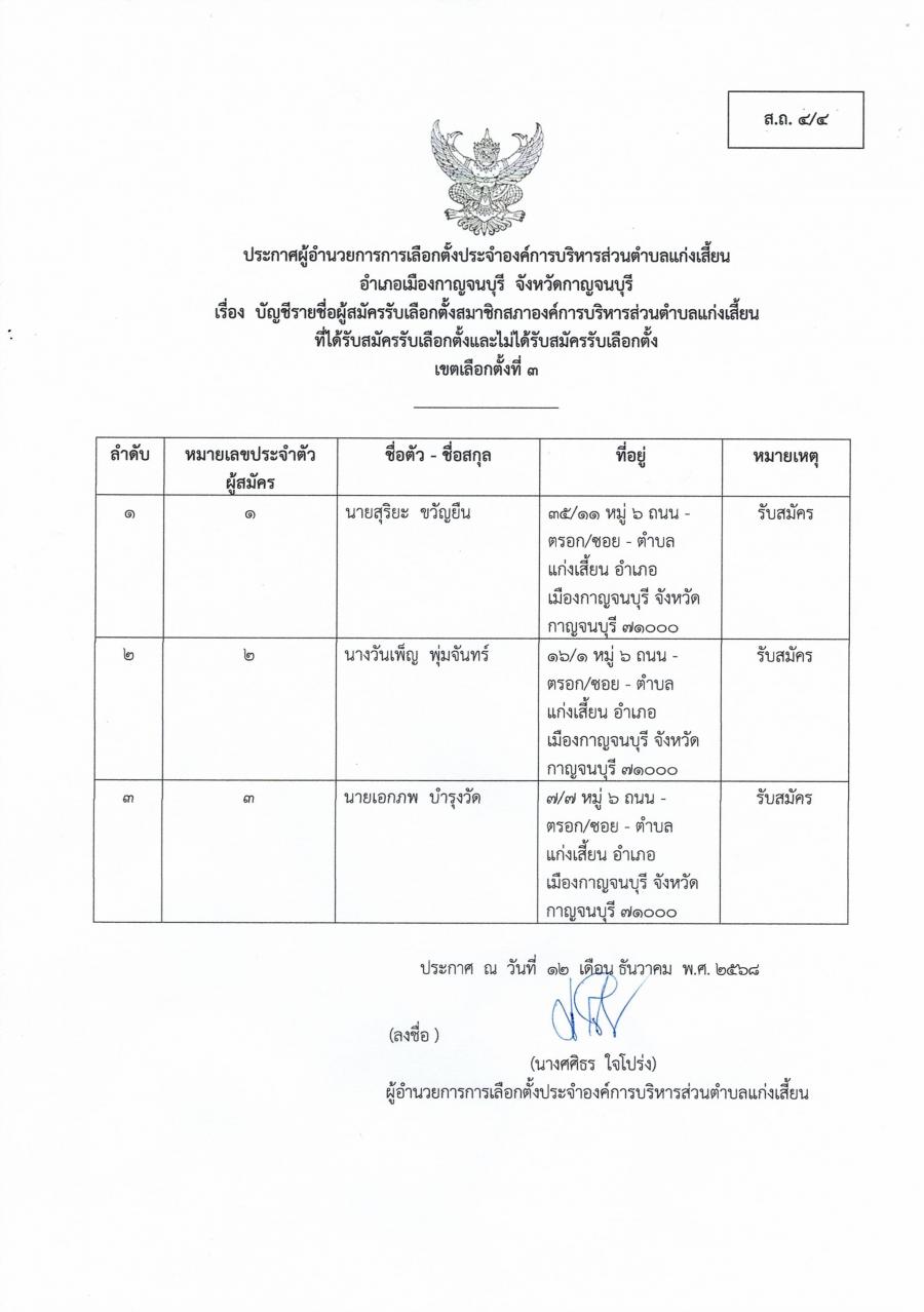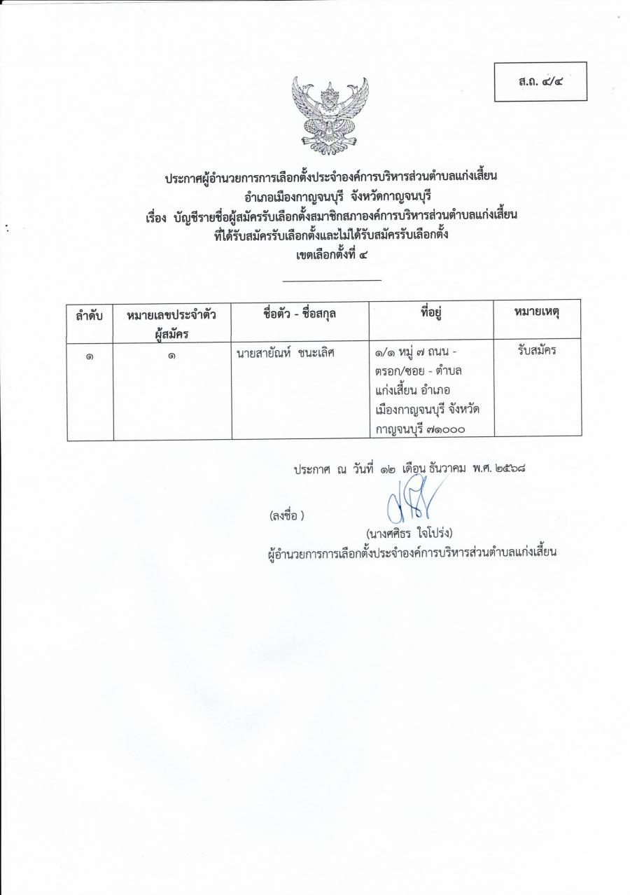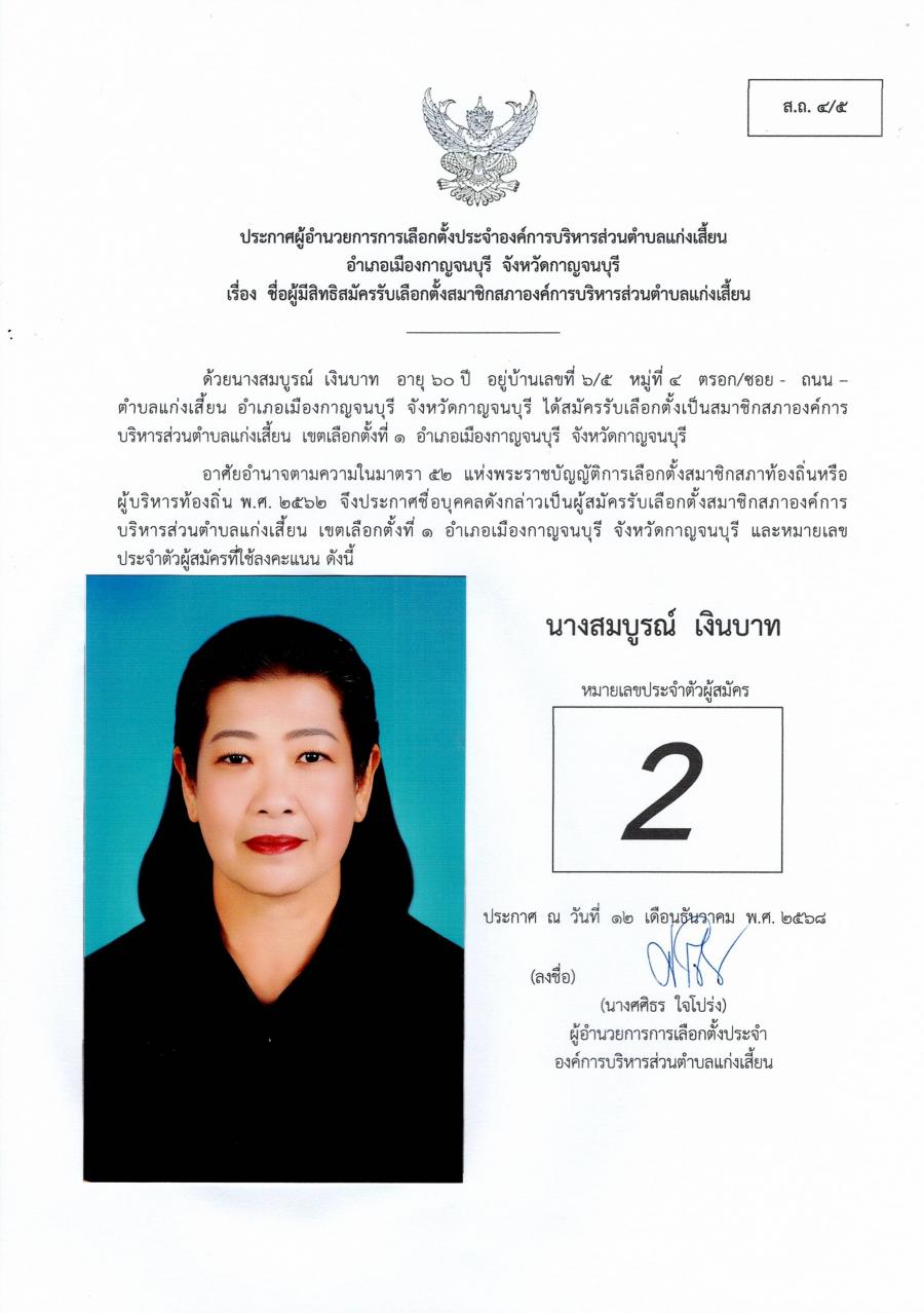 ประกาศบัญชีรายชื่อผู้มีสิทธิสมัครฯ(ส.ถ.4/4) และรายชื่อผู้สมัครรับเลือกตั้งสมาชิกภาองค์การบริหารส่วนตำบล องค์การบริหารส่วนตำบลแก่งเสี้ยน(ส.ถ.4/5)