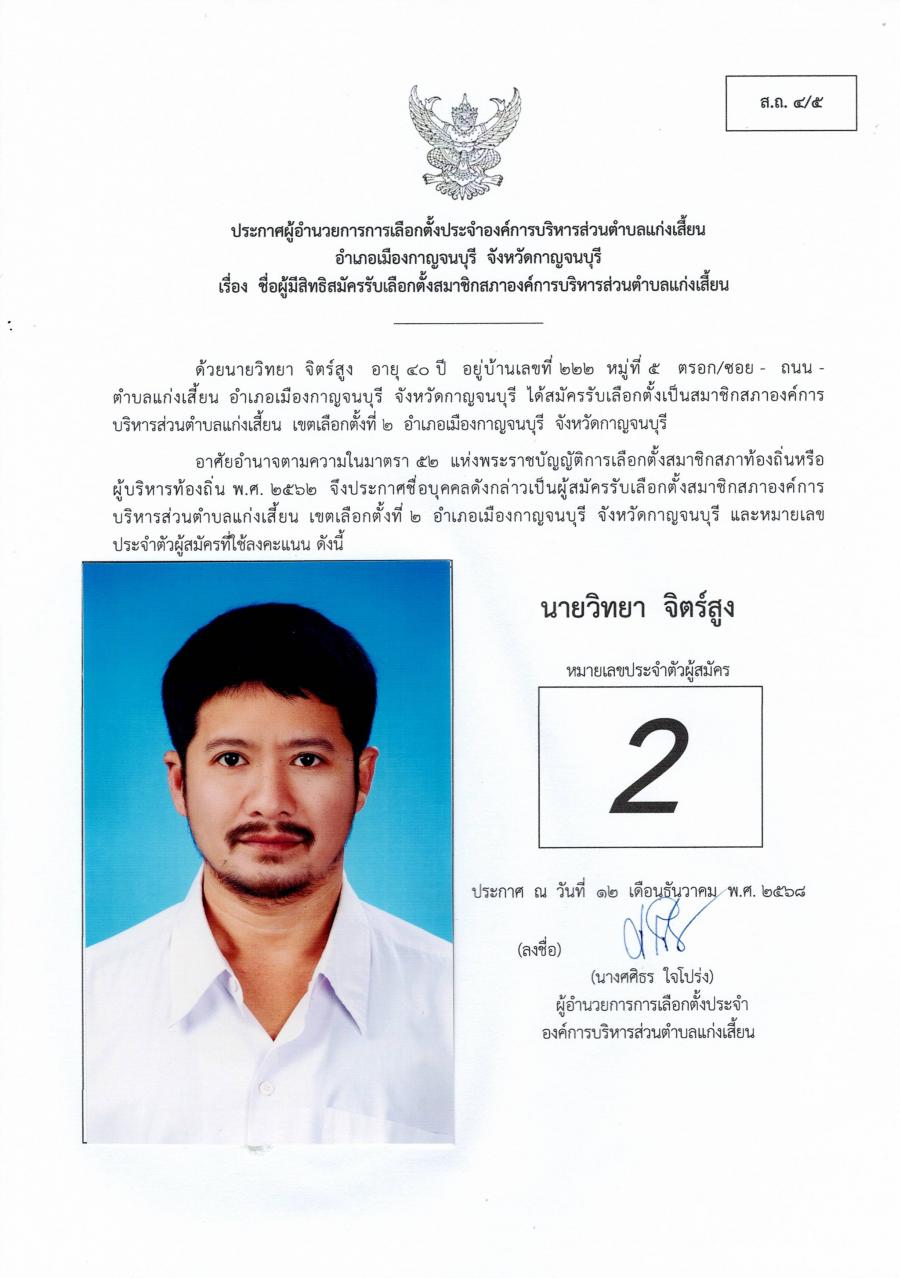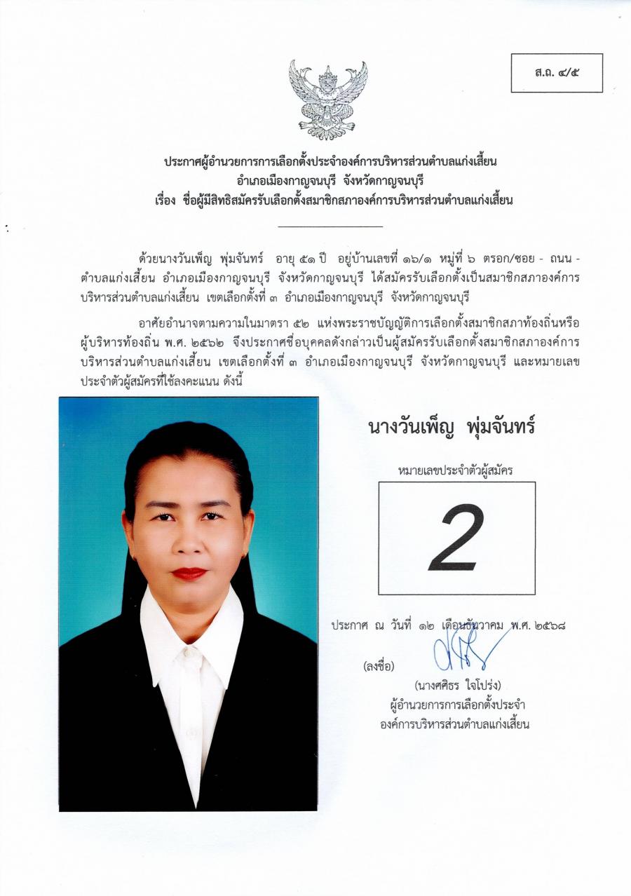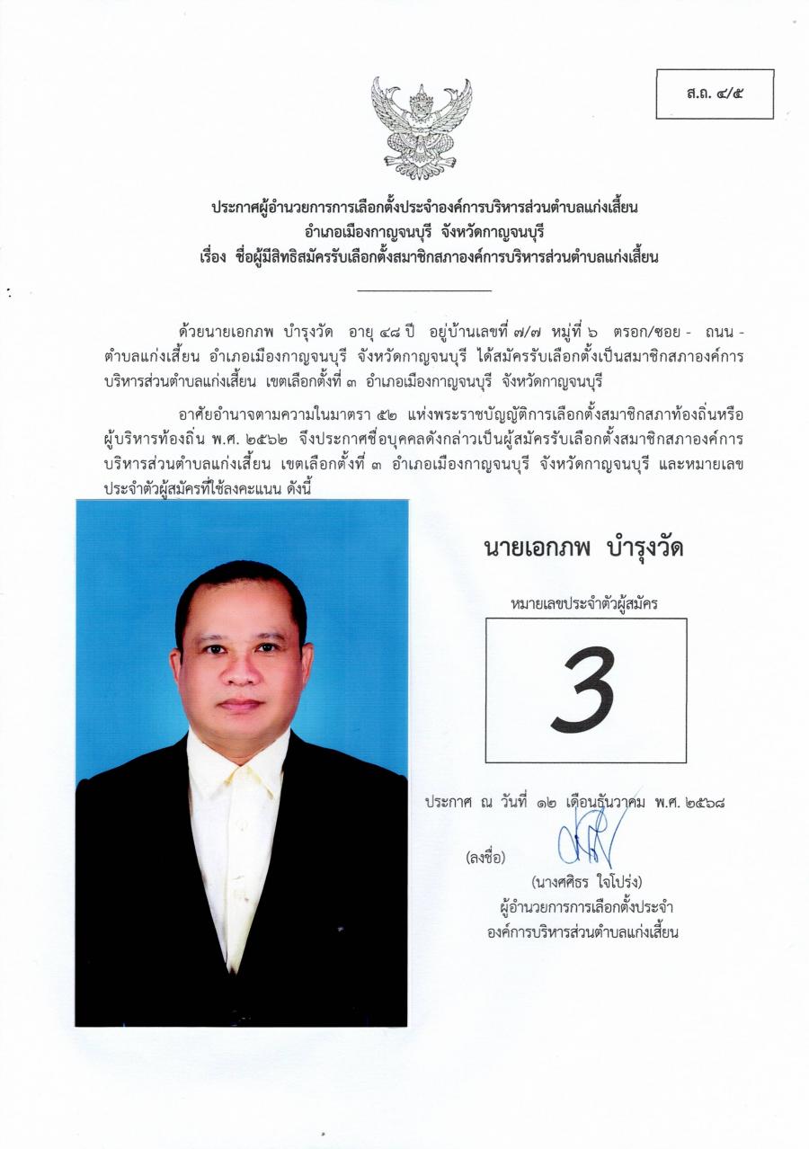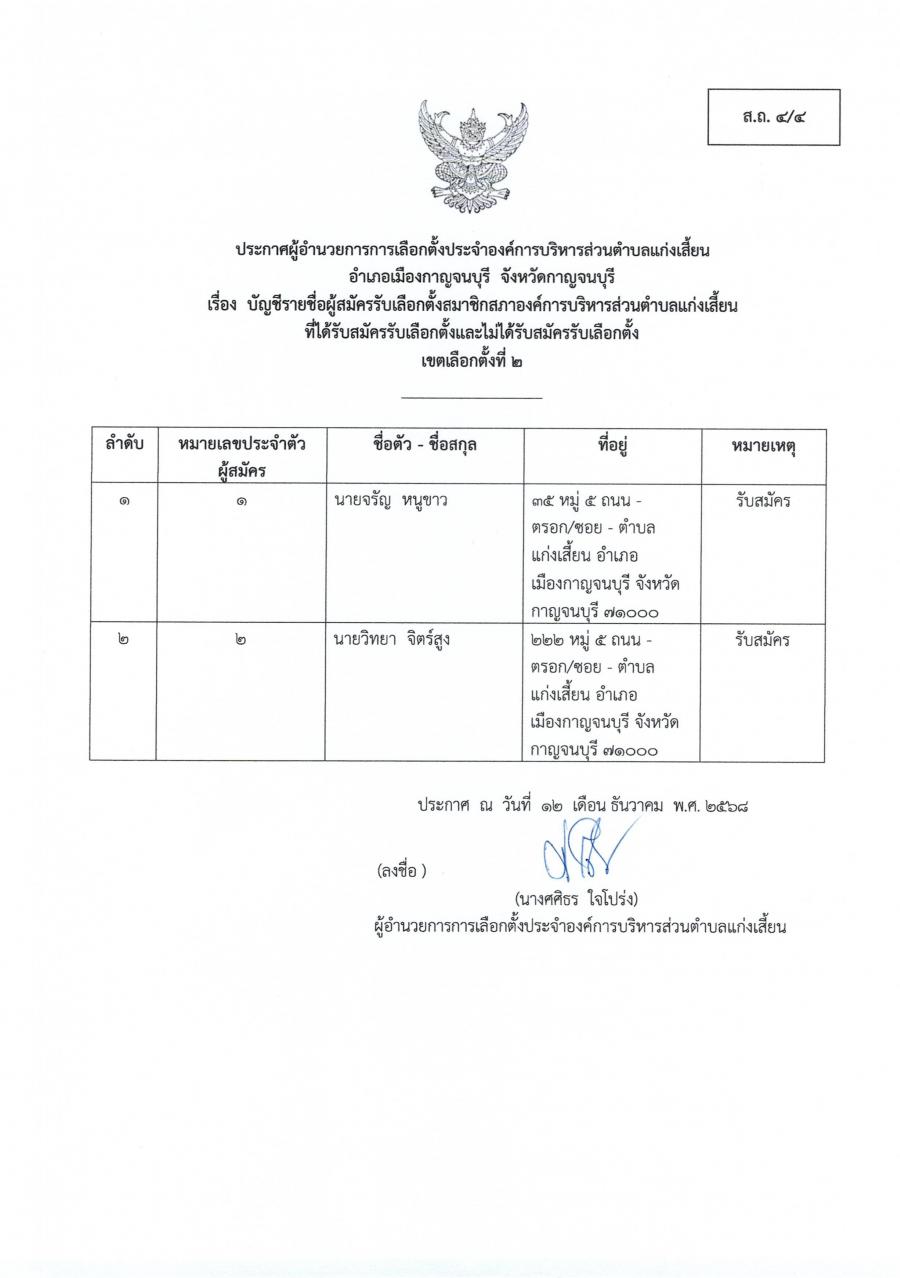ประกาศบัญชีรายชื่อผู้มีสิทธิสมัครฯ(ส.ถ.4/4) และรายชื่อผู้สมัครรับเลือกตั้งสมาชิกภาองค์การบริหารส่วนตำบล องค์การบริหารส่วนตำบลแก่งเสี้ยน(ส.ถ.4/5)
