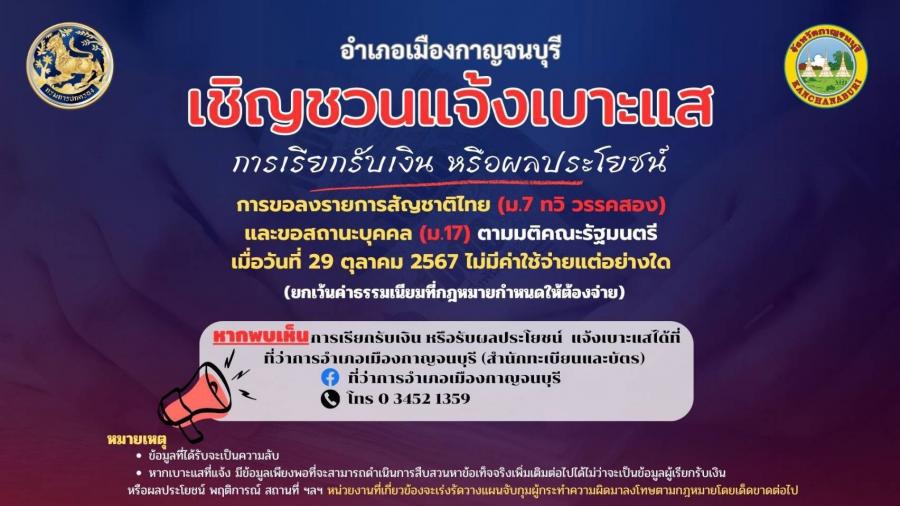 อำเภอเมืองกาญจนบุรีเชิญชวนแจ้งเบาะแสการเรียกรับเงิน หรือผลประโยชน์