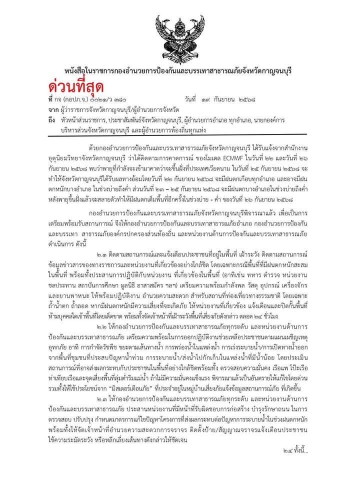 จังหวัดกาญจนบุรี แจ้งเตือนประชาชน ทั้ง13 อำเภอ ในพื้นที่เสี่ยงภัยน้ำท่วม น้ำป่าไหลหลาก และดินถล่ม เฝ้าระวังสถานการณ์อย่างใกล้ชิด ติดตามประกาศจากทางราชการอย่างต่อเนื่อง และเตรียมพร้อมรับมือเพื่อความปลอดภัยของชีวิตและทรัพย์สิน